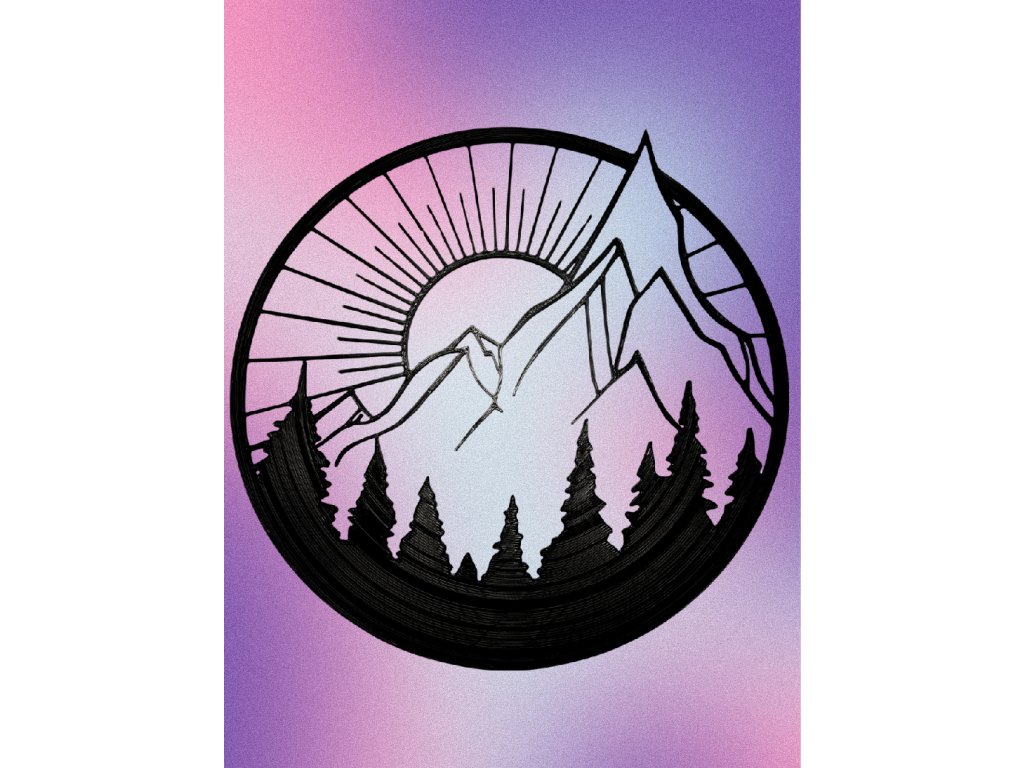 Stylová 3D dekorace s motivem západu slunce za horami, která v sobě spojuje klid přírody a moderní design.